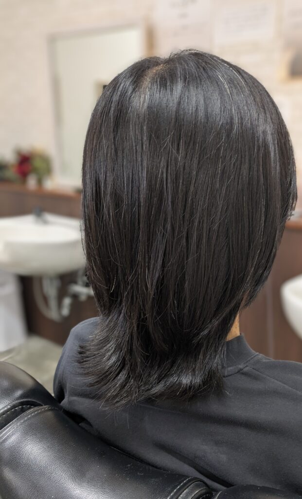 長年、1つに結んで襟足に【結びクセ】が付いてしまい、襟足の髪が暴れてしまったお客様。前回短めにしたけれど、伸びてしまって、また【結ぶ】ことが続いて今回も襟足の髪が暴れちゃいました>.<